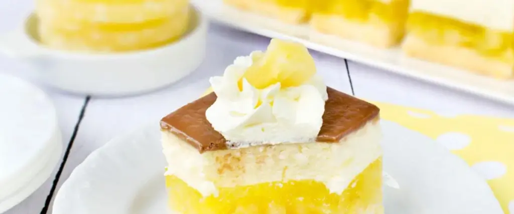 9 Cortar según tamaño deseado. Finalizar con una decoración de chocolate, trozos de piña caramelizados previamente cubiertos con brillo.