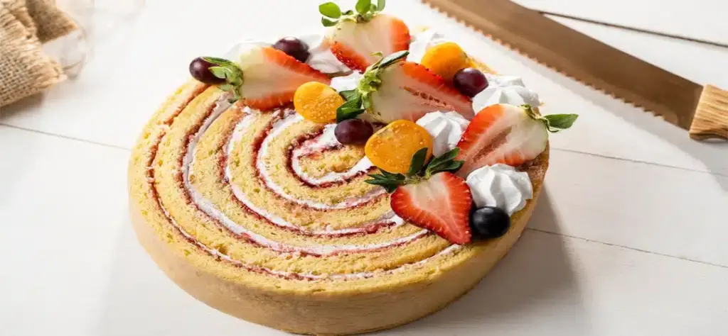 6 Con la ayuda de una manga y boquilla rizada, realizar ruches con la crema de chocolate blanco por el borde del rollo.